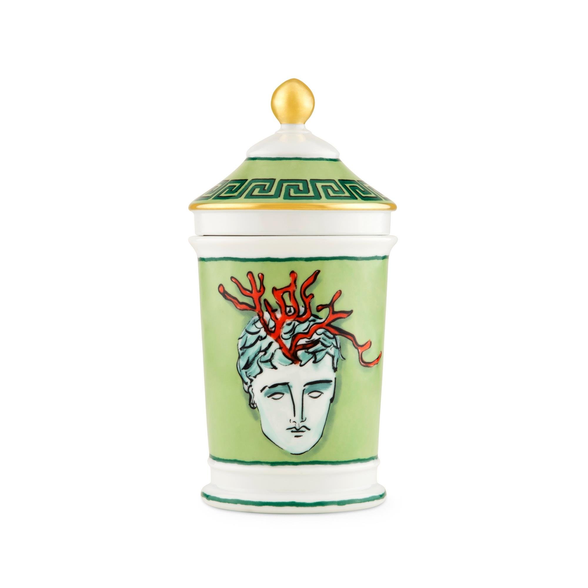 Saf altın işlemeli, porselen yeşili eczacı vazosu. Viaggio di Nettuno koleksiyonu.
